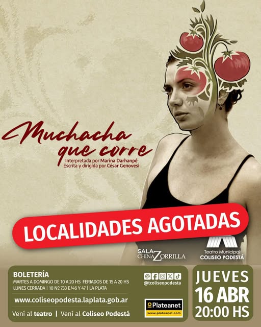 “Muchacha que corre”, producida por la propia actriz, se presentó con localidades agotadas en la bellísima Sala China Zorrilla del Teatro Municipal Coliseo Podestá, en el marco de un ciclo que inició la gestión de Alejo García Pintos como Director, en el que se ofrecen obras de teatro y espectáculos musicales todos los jueves a las 20 hs, con entradas sumamente accesibles.